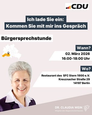 im April 2026 lädt Sie Frau Dr. Claudia Wein, MdA, herzlich zu zwei Veranstaltungen ein. Wir freuen uns, mit Ihnen ins Gespräch zu kommen und aktuelle Themen gemeinsam zu diskutieren:
