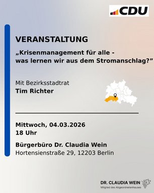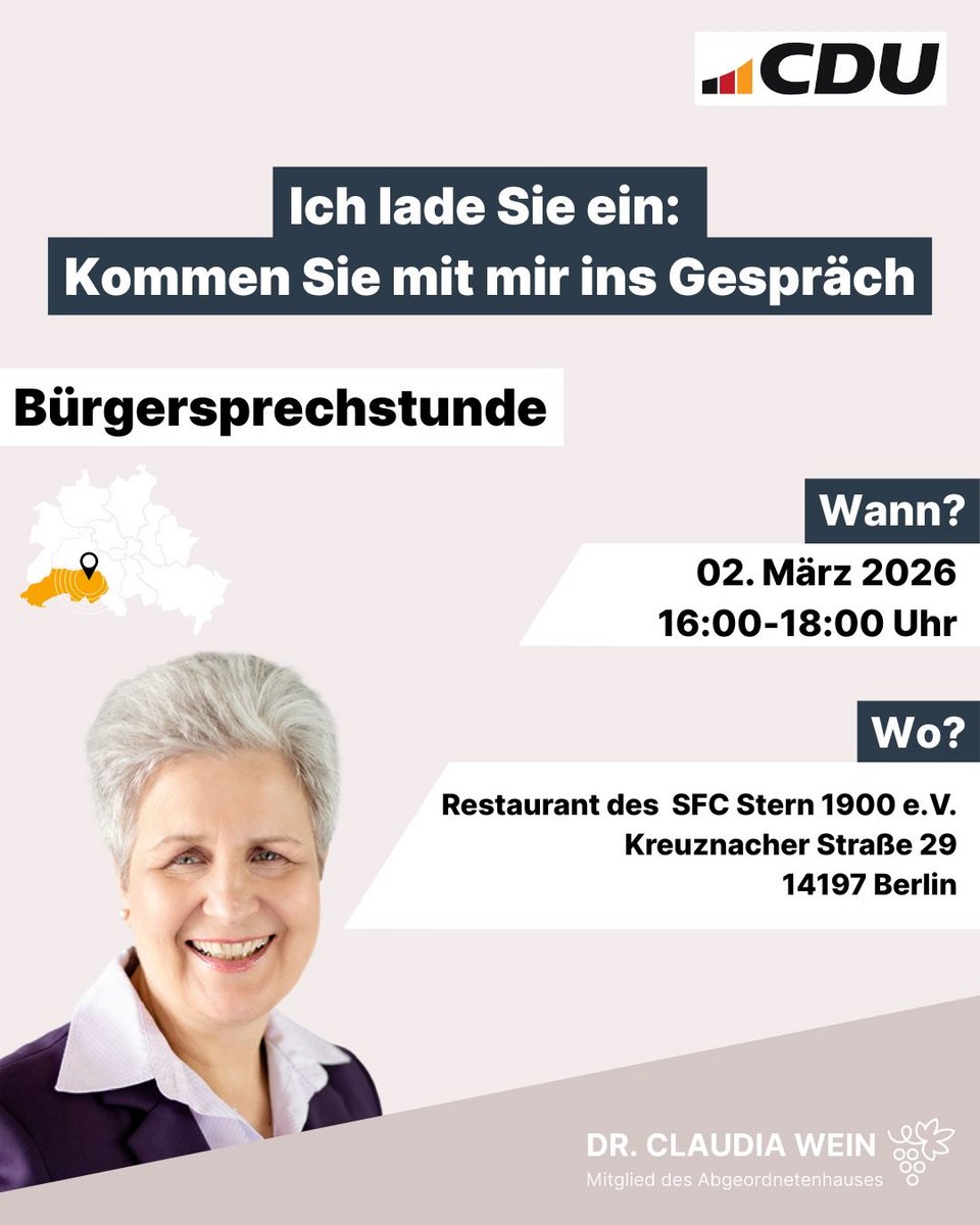 im April 2026 lädt Sie Frau Dr. Claudia Wein, MdA, herzlich zu zwei Veranstaltungen ein. Wir freuen uns, mit Ihnen ins Gespräch zu kommen und aktuelle Themen gemeinsam zu diskutieren: